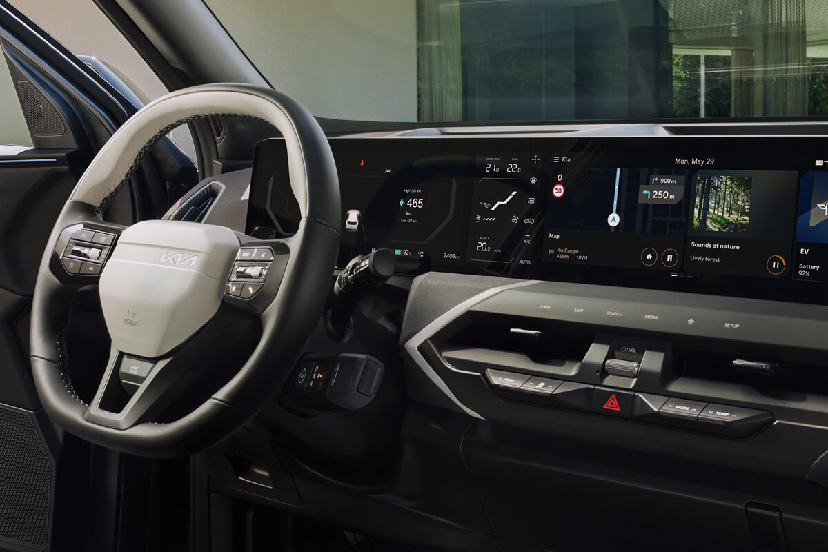 Im Innenraum erwartet dich Technik, die nicht nur modern aussieht, sondern dir das Leben leichter macht. Das Dreifach-Panoramadisplay zieht sich bis in die Mitte des Armaturenbretts und vereint Fahrerdisplay, Klimasteuerung und Infotainment inklusive EV-Routenplaner. Dazu kommen Kia Connect, kabelloses Apple CarPlay und Android Auto, Over-the-Air-Updates und Kia Upgrades. Ausstattungshighligts wie Digital Key 2.0 und ein KI-Assistent mit erweiterten Sprachfunktionen schaffen ein Fahrerlebnis, das sich vernetzt, intuitiv und überraschend leicht anfühlt. Selbst Videostreaming im Fahrzeug ist möglich, wenn der EV5 geparkt ist.