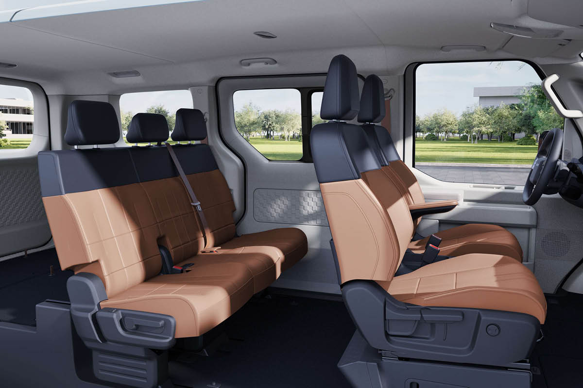 - Passenger: Personenbeförderung mit flexibler Sitzkonfiguration, USB-Ladeanschlüssen, optionaler beheizter Sitze – ideal für Shuttles, Taxi oder barrierefreien Transport.